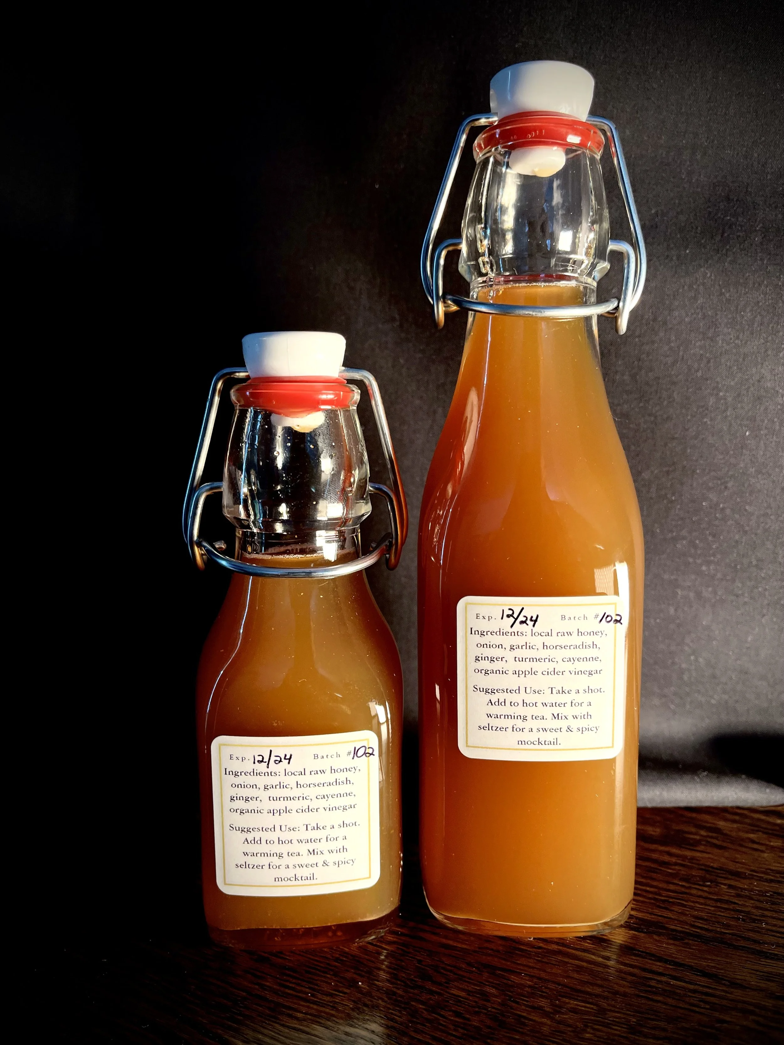 Ingredients: ginger, garlic, onion, horseradish, cayenne, turmeric, local wild apple cider vinegar, local honey